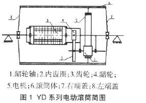 YD 系列電動滾筒的內(nèi)部結(jié)構(gòu)主要有電動機和減速裝置這兩大部分(如圖 1 所示),此外還有用來支撐輸送帶并驅(qū)動其運動的滾筒體,用來支撐電動滾筒整體的前后軸、支座,以及聯(lián)接滾筒體與前后軸的端蓋、壓蓋、軸承、密封圈等零部件。